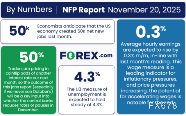 目前关于10月非农就业报告会否发布仍无定论,这份9月报告或将成为美联储年底最后一次会议前评估劳动力市场的最终依据之一。届时FOMC将就12月是否降息这一艰难抉择进行讨论。目前市场对美联储12月再度加息的概率预期为50%,这意味着本次数据公布可能引发显著市场波动(不过更具时效性的12月非农报告仍将占据更大权重)。
