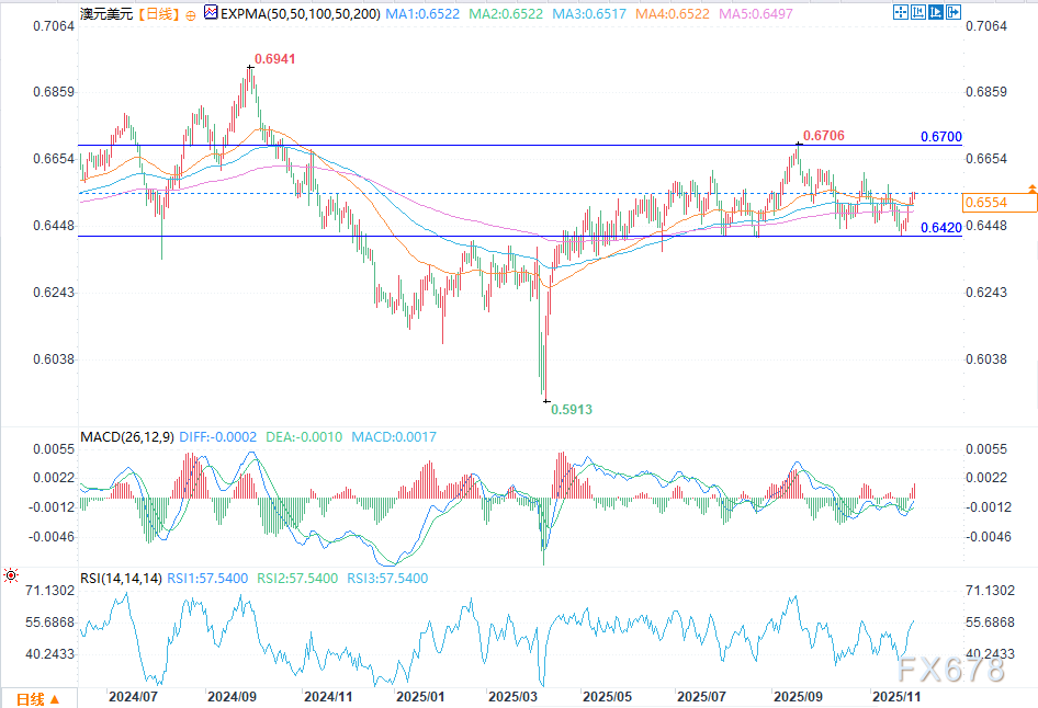 汇通财经APP讯——周一(12月1日)欧盘时段,澳元/美元日内分时图显示其在0.6543-0.6556区间震荡,现价0.6553逼近区间上沿,亚市早盘与午后放量冲高后缩量回落,短期多头动能在压力位前有所衰减。